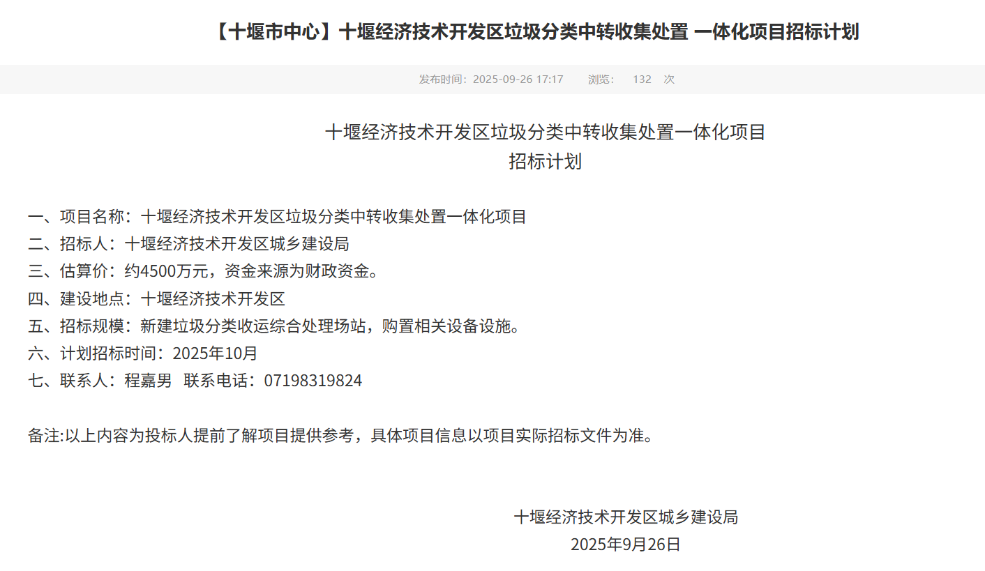 4500万!湖北十堰垃圾分类中转收集处置一体化项目即将招标